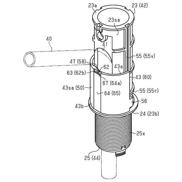 【解決手段】水栓1は、上下方向に延在する主管部5と、この主管部5から分岐した枝管部6と、この枝管部6の先端6aに対して着脱可能に保持される吐水ヘッド7と、を備える。また、水栓1は、吐水ヘッド7に対して第1端部40aが接続されるとともに、枝管部6に挿通されることにより主管部5の下端5bから第2端部40b側が下方に引き出された送水ホース40を備える。そして、水栓1は、主管部5内に配置される送水ホース40との摺接部47を有して、その主管部5内に収容される水切り部材60としての機能を有したホースガイド43を備える。