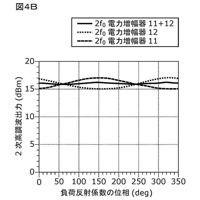 前記第3出力端から前記第5出力端を見た場合の前記基本波の第1反射位相と、前記第4出力端から前記第5出力端を見た場合の前記基本波の第2反射位相との差が180°となるよう構成され、かつ、