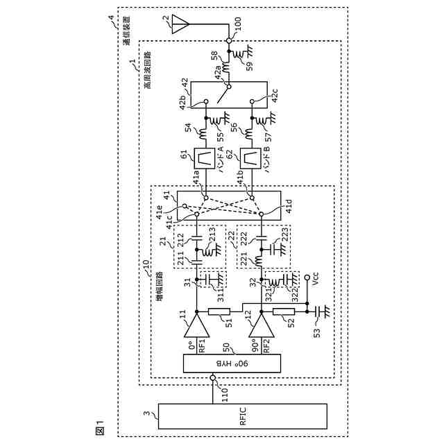 特許文献1には、バランスアンプを構成する第1増幅器および第2増幅器と、第1増幅器の出力端および出力端子を結ぶ第1出力経路に配置された第1移相回路と、第2増幅器の出力端および出力端子を結ぶ第2出力経路に配置された第2移相回路と、第1移相回路の出力端および第2移相回路の出力端に接続された抵抗と、第1移相回路の出力端および出力端子の間に接続された第1インダクタと、第2移相回路の出力端および出力端子の間に接続された第2インダクタと、を備える半導体装置(高周波回路)が開示されている。これによれば、抵抗、第1インダクタおよび第2インダクタで構成される電力結合器における電力合成の損失を低減できるとしている。