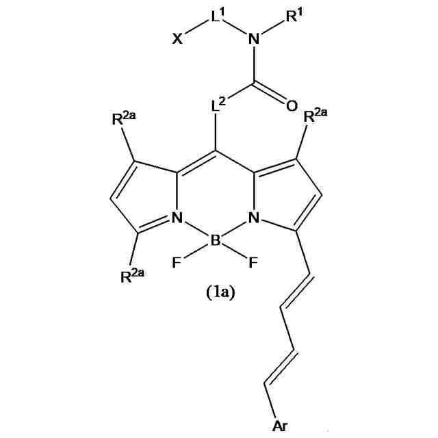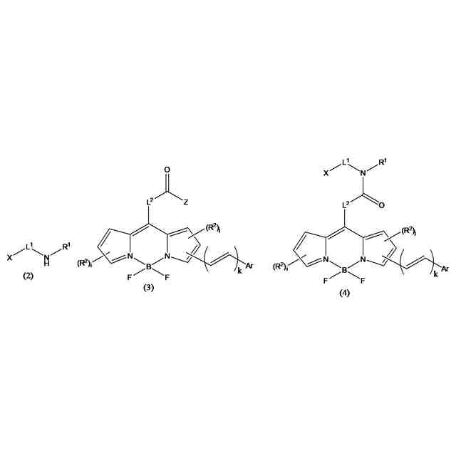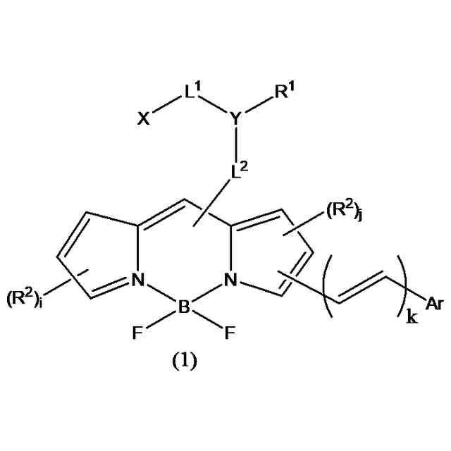 は炭素数1から6のアルキレン基を表し、Arは芳香族基を表し、Xはカルボキシ基、スルホン酸基、リン酸基またはそれらの誘導体を表し、Zはヒドロキシ基、ハロゲン原子、炭素数1から3のアルキルオキシ基、またはN-コハク酸イミドキシ基を表す。iおよびjはそれぞれ独立して0から2の数を表し、kは2から4の数を表す)