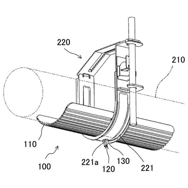 湾曲した帯状のバンド部を有する長尺材支持具によって長尺材を支持する場合、支持面積を大きくするためにバンド部と長尺材との間にプレート部材を介在させることがある。上記のようなプレート部材は、例えば、長尺材支持具のバンド部側に形成されたT形突起をバンド部に形成された溝部に係合させることによって固定される(例えば、特許文献1参照。)。