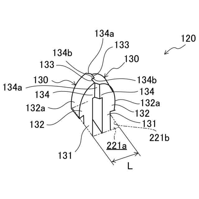 上記内方当接部が、上記バンド部の上記係止穴における上記対向する内縁部を結ぶ第1の方向と交差する第2の方向に相対的にずれた位置で、上記1対の係止体の上記外方部どうしが互いに近づく方向に接近した位置にあることにより、上記挿入可能状態になる一方、