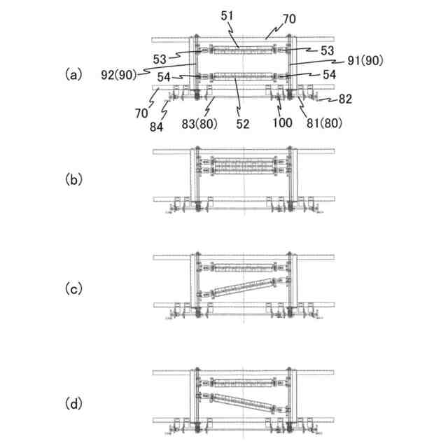 前記第一回転体及び前記第二回転体の少なくとも一方は、前記第一レール材に沿った一端側の移動と、前記第二レール材に沿った他端側の移動とを切り離して、水平方向の向きを変更可能であり、