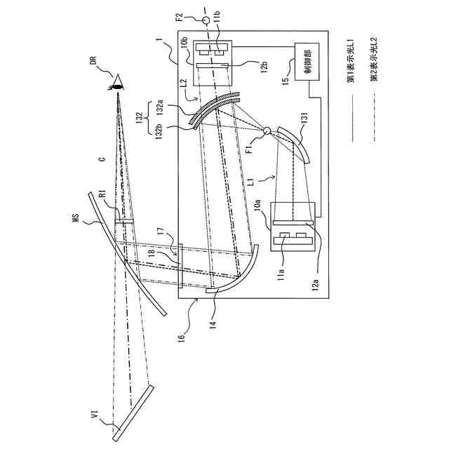 図1は、本実施形態に係るHUD装置の構成を示す図である。図1において、HUD装置1は、例えば可視波長域の光を出す第1光源11aと、当該第1光源11aが出射した光を透過して直線偏光の第1表示光L1として出射し、運転者DRの前方に結像される表示像の実像RIを表示する第1表示器12aと、を少なくとも有する第1PGU(Picture Generation Unit)10aを備える。また、例えば可視波長域の光を出す第2光源11bと、当該第2光源11bが出射した光を透過して直線偏光の第2表示光L2として出射し、運転者DRの前方に結像される表示像の虚像VIを表示する第2表示器12bと、を少なくとも有する第2PGU10bを備える。