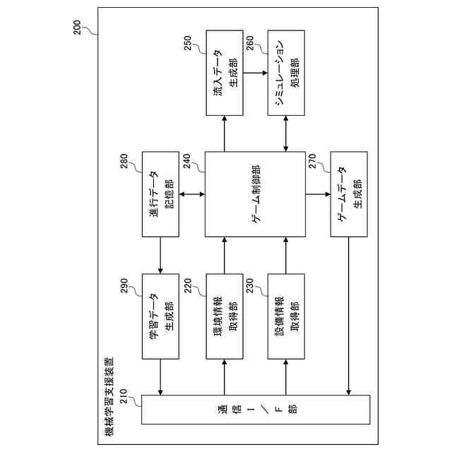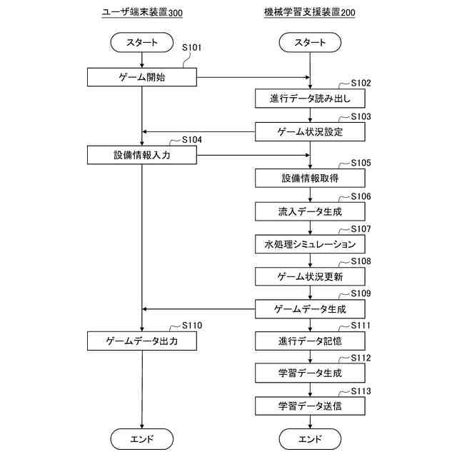 【解決手段】 機械学習支援装置は、仮想的な下水道施設が配置されたゲームマップにおいて、ゲーム状況を設定するゲーム制御部と、ゲーム状況に対してユーザが決定する運転設定であって前記下水道施設に備えられる設備の運転設定を含む設備情報を取得する取得部と、前記ゲームマップにおける天候、人口及び工業発展度の少なくとも1つの情報に基づいて、前記下水道施設へ流入する下水の水量及び水質を示す流入データを生成する流入データ生成部と、設備情報と流入データとに基づいて、前記下水道施設における水処理をシミュレーションするシミュレーション処理部と、前記設備情報と前記流入データとシミュレーション結果とを対応付けて機械学習に用いられる学習データを生成する生成部と、を有する。
