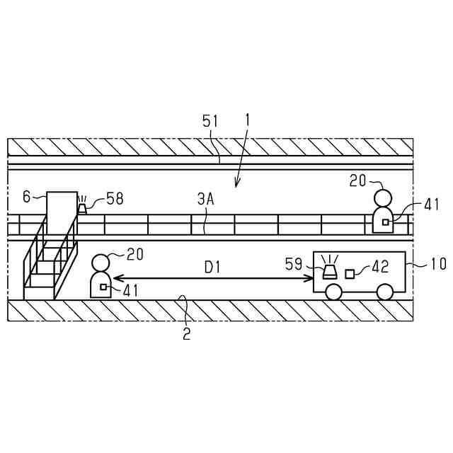 本実施形態では、X方向に沿って延びる走行路2に対してY方向の両側に進入禁止領域が設けられている。一方の進入禁止領域には、作業員20が通行するための第1作業員通路3Aが設けられている。また、他方の進入禁止領域には、第2作業員通路3Bと、土砂5等を運搬するためのベルトコンベア4と、が設けられている。ベルトコンベア4は、一例として、走行路2と第2作業員通路3Bとの間に位置する。