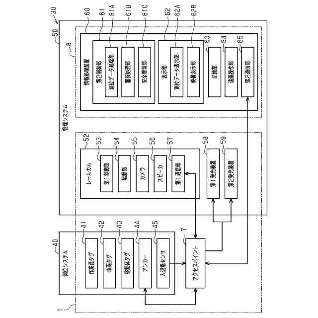 図1に示すように、本実施形態の監視空間は、一例として、工事が行われているトンネル1の坑内である。なお、監視空間は、トンネル1以外にも、衛星測位システム(GNSS)に基づく信号の受信環境が悪い屋内または屋外の空間でもよい。トンネル1では、トンネル軸方向をX方向、幅方向をY方向、及び、高さ方向をZ方向とする。