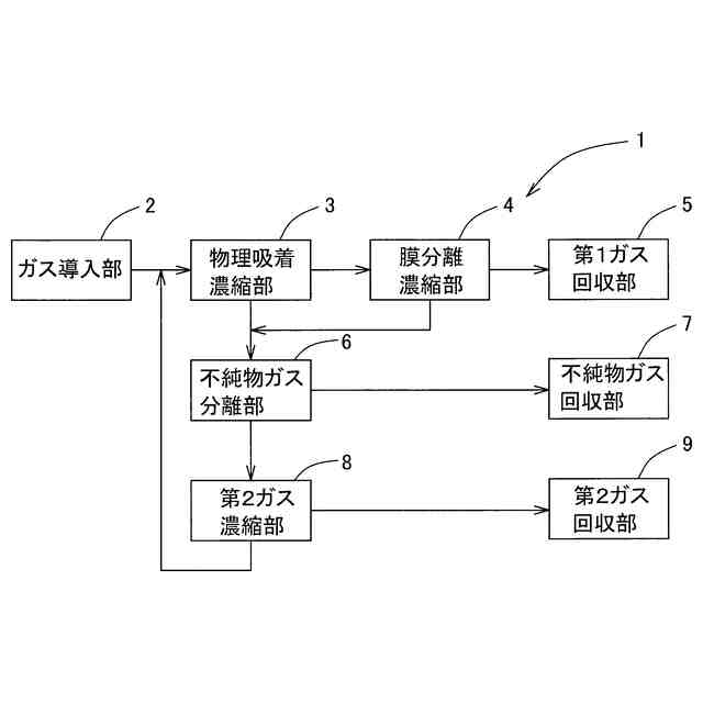 【解決手段】第1ガスと第2ガスを含む混合ガスを導入するガス導入部と、ガス導入部に導入された混合ガスから物理吸着によって第1ガスを濃縮した第1濃縮ガスを生成し、第1濃縮ガスと、第2ガスを含む第1排出ガスとを分離させる物理吸着濃縮部と、物理吸着濃縮部で生成された第1濃縮ガスから膜分離によって第1ガスを濃縮した第2濃縮ガスを生成し、第2濃縮ガスと、第2ガスを含む第2排出ガスとを分離させる膜分離濃縮部と、第1排出ガス及び/又は第2排出ガスから第2ガスを濃縮した第3濃縮ガスを生成し、第3濃縮ガスと第3排出ガスとを分離させる第2ガス濃縮部を有し、第2ガス濃縮部は、第3排出ガスを物理吸着濃縮部に導入する構成とする。