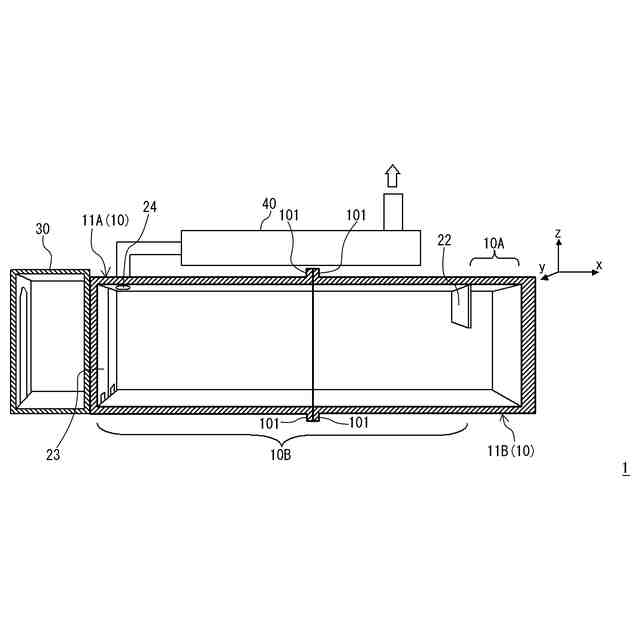 図3の構造において、訓練対象者Hは右側の煙調整フラッパー22と左側の扉23の間に位置し、所望の訓練作業をすることができる。この際、燃焼が発生しているのは煙調整フラッパー22よりも右側となるため、本体部90の内部の空間は、煙調整フラッパー22を境界として、その右側(x方向正側)が燃焼部90A、左側(x方向負側)が訓練室90Bとなる。本体部90においては、訓練室90Bにおける扉23の近くの天井には排気口24が設けられ、排気口24を介して排煙処理部40が連結されている。この構造により、濃煙Sは煙調整フラッパー22の下側を通って燃焼部90Aから訓練室90Bの天井側を図中左側に向けて流れる。