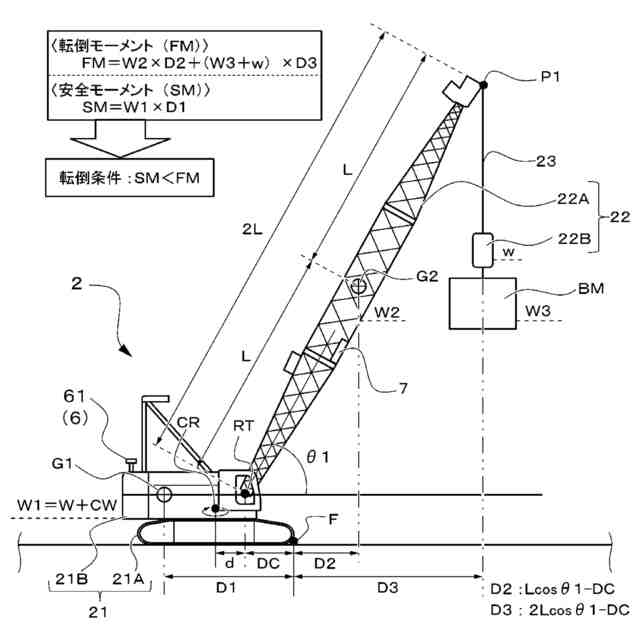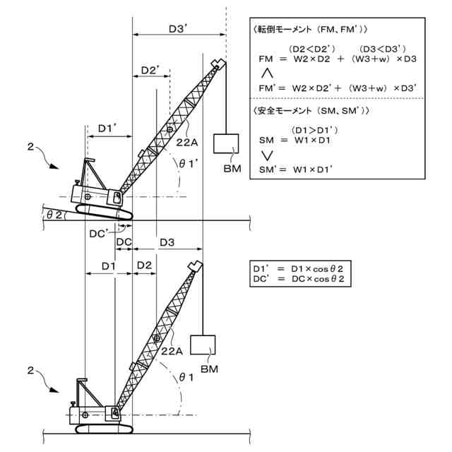 このため、転倒を回避するには、ブーム等の傾斜角度と吊荷の重量だけでなく、クレーン自体の傾斜にも注意を払う必要がある。