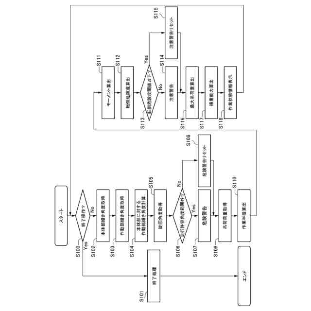 前記姿勢検出部、前記傾斜角検出部、及び、前記荷重検出部の検出する検出結果に基づき、転倒支点から前記本体部側に働く安全モーメントと前記転倒支点から吊荷側に働く転倒モーメントを算出する処理と、