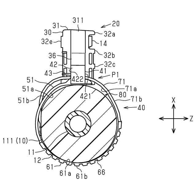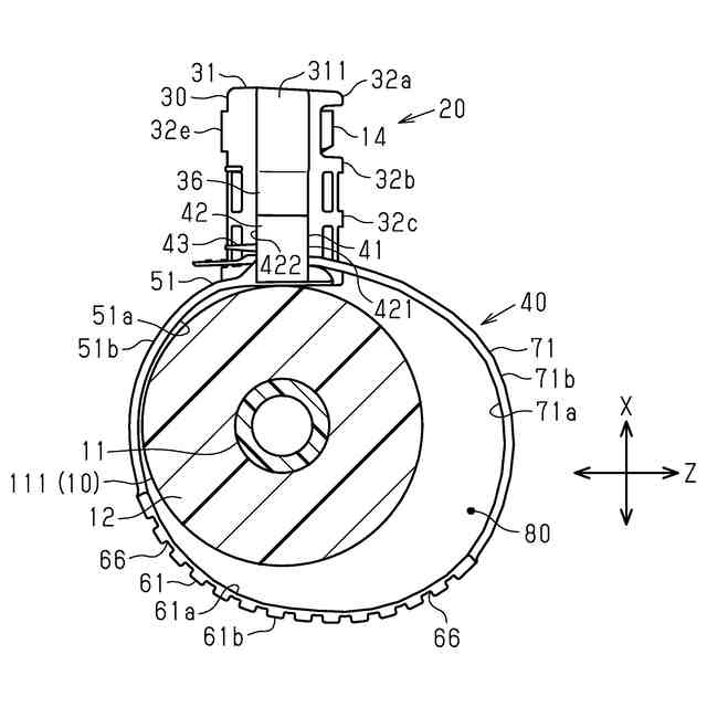 前記保持部は、前記軸線の延長線を、前記第1縁部と前記第2縁部とで挟むように前記囲繞空間を形成した大空間囲繞位置と、前記延長線に対し、前記大空間囲繞位置に比べて、前記第2縁部よりも前記第1縁部が近くなるように前記囲繞空間を形成した小空間囲繞位置との範囲の間で前記囲繞空間を形成可能であり、