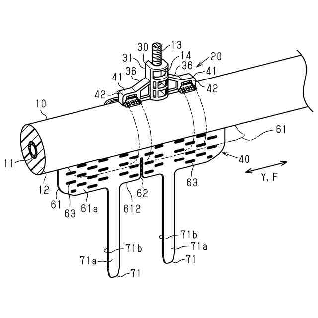 前記保持部の有する締結帯部が、前記プレート部から前記幅方向へ帯状に延出して前記プレート部とともに前記配管材を囲繞するとともに、