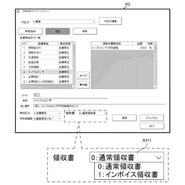 ところで、例えば日本国においては、診療に関する領収書の形態の一例として、インボイス対応領収書と、通常領収書(インボイス非対応領収書)と、が存在する。前記業務支援システムにおいて、発行可能な前記領収書の形態が前記通常領収書だけであると、例えば、前記インボイス対応領収書については、人が手書きで領収書を発行する必要があり、結果的に、前記領収書の発行に手間がかかることがあるという問題がある。