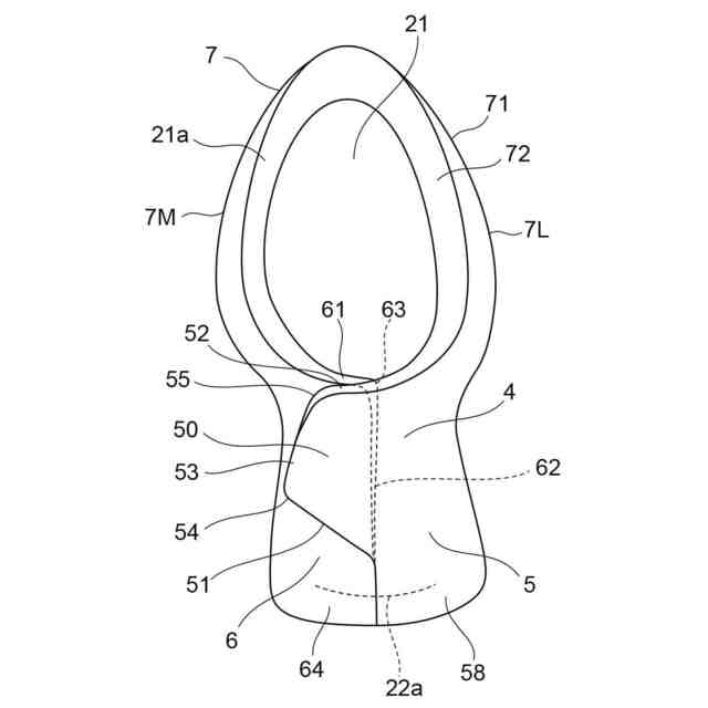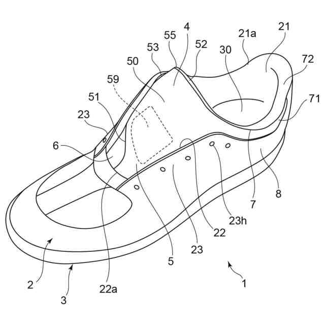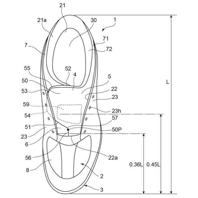 以下、シューズ1の長さ方向を「前後方向」といい、シューズ1の踵から爪先に向かう方向を「前方」といい、その反対方向を「後方」という。シューズ1を水平面に載置した状態で鉛直な方向を「上下方向」といい、重力の方向を「下方」といい、その反対方向を「上方」という。また、シューズ1の幅方向を単に「幅方向」といい、シューズ1の着用者の足の第1趾側を「内足側」といい、第5趾側を「外足側」という。