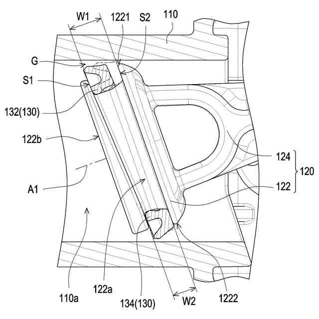 本発明の1つの実施形態において、上述した環状溝は、第1内壁と第2内壁とを有し、第1内壁と第2内壁は環状溝の幅方向において互いに対向し、第1内壁は第2内壁と前端との間に位置し、ピストンリングの第1部分とピストン通路の内壁との間の間隙は、第1部分が第2内壁から第1内壁へ移動するにつれ増大する。