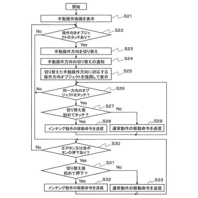 また、前記携帯端末は、前記タッチパネルディスプレイに手動操作画面を表示し、前記手動操作画面に表示される操作向きオブジェクトがタッチされると、タッチされた前記操作向きオブジェクトに基づいて前記手動操作方向を切り替えるとともに、前記手動操作画面に表示され、切り替えた前記手動操作方向に対応する操作方向オブジェクトを強調して表示し、前記手動操作方向の切り替え後に初めて、切り替えのためにタッチされた前記操作向きオブジェクトと同一の操作方向に関する前記操作向きオブジェクトがタッチされた場合、切り替えた前記手動操作方向の正の向き又は負の向きへの前記インチング動作の移動命令を前記ロボットに送信するようにしても良い。