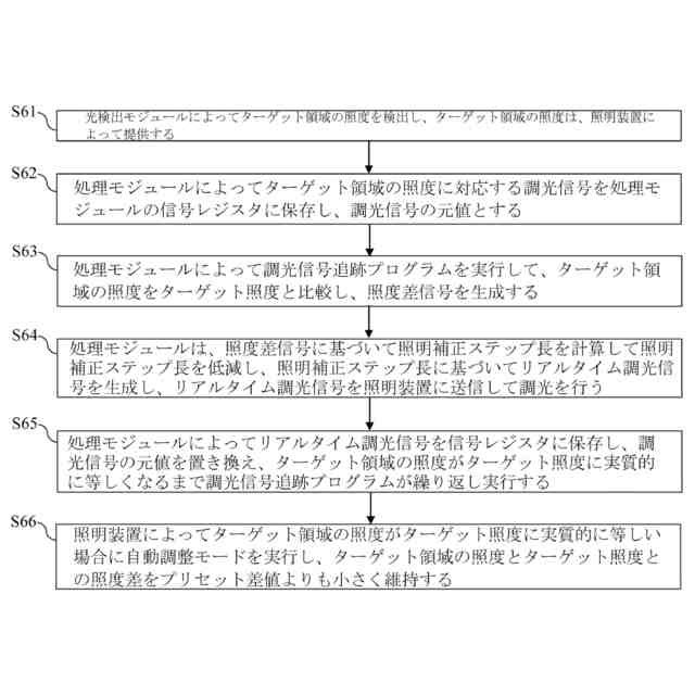 前記処理モジュールは、前記照度差信号に基づいて照明補正ステップ長を計算して前記照明補正ステップ長を低減し、前記照明補正ステップ長に基づいてリアルタイム調光信号を生成し、リアルタイム調光信号を前記照明装置に送信して調光を行う工程と、