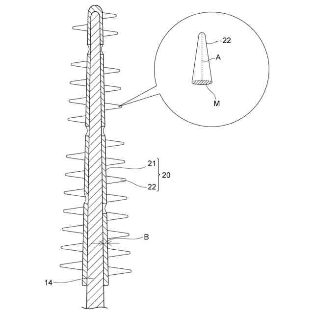 芯基材部は、その先端に向かうにつれて縮径するテーパ形状に形成されている。そして、突起部も芯基材部の先端に向かうにつれて小さくなっており、比較的狭い歯間から比較的広い歯間までを効果的に清掃することができる。一方で、突起部は、その第一目的である歯間の清掃のみならず、清掃時に歯茎に触れ、歯肉をマッサージするという目的にも使用されており、特に歯茎が下がってくる中高年以降でのニーズが高い。歯肉のマッサージ効果を高める方法としては、突起部の強度(コシ)を強くする、すなわち突起部の底面積を広くすることが考えられるが、芯基材部の先端から基端に向かって例えば15mm以上の芯基材部の比較的直径が大きい領域では軟質部の歯間への挿入性が悪化してしまうという課題が発生する。