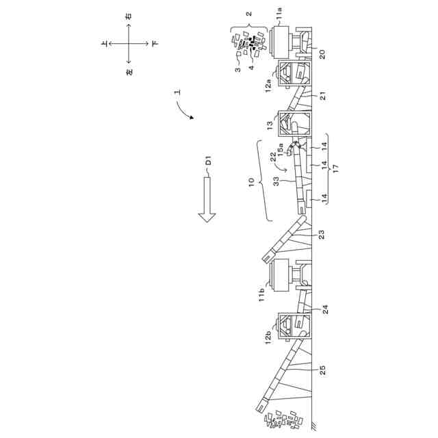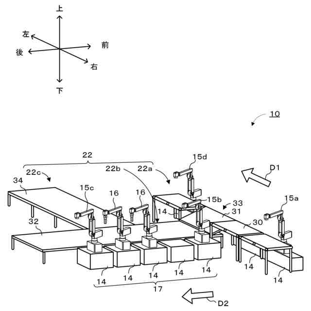 次に、本開示を実施するための形態について図面を参照しながら説明する。図1はリサイクルシステム1の構成を示す説明図、図2は異物除去システム10の概略構成を示す斜視図、図3はクランプ機構19の概略構成を示す斜視図、図4は撮影モジュール15の概略構成を示す斜視図、図5はピッキングモジュール16の概略構成を示す斜視図、図6は異物除去システム10の電気的な接続関係を示すブロック図である。なお、本実施形態において、左右方向、前後方向及び上下方向は、図1及び図2に示した通りとする(図1では前後方向は紙面に垂直方向)。また、本実施形態において、廃材2を第1搬送部22aで搬送する方向を第1搬送方向D1、第2搬送部22bで搬送する方向を第2搬送方向D2と称するものとする。