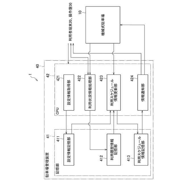 【解決手段】 充電設備の利用対象の車両が駐車場に入庫すると当該車両の出庫予測時刻を特定し、現時点で最も早く充電設備の利用を開始可能な利用開始可能時刻を特定し、特定した利用開始可能時刻から予め設定された充電時間分経過した時刻が入庫した車両の出庫予測時刻以前であれば、利用開始可能時刻を入庫した車両の設備利用開始時刻として特定し、特定した設備利用開始時刻から充電時間分経過した時刻を入庫した車両の設備利用終了時刻として特定し、特定した情報に基づいて利用スケジュール情報を更新する利用スケジュール情報更新部423を備える。