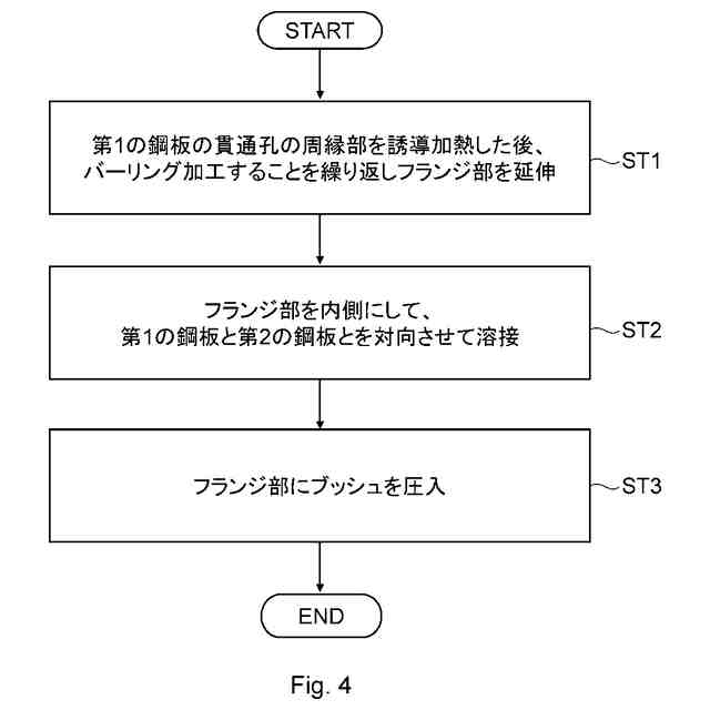 第1の鋼板に形成された貫通孔の周縁部を誘導加熱してひずみを除去した後、前記周縁部をバーリング加工してフランジ部を形成する工程と、