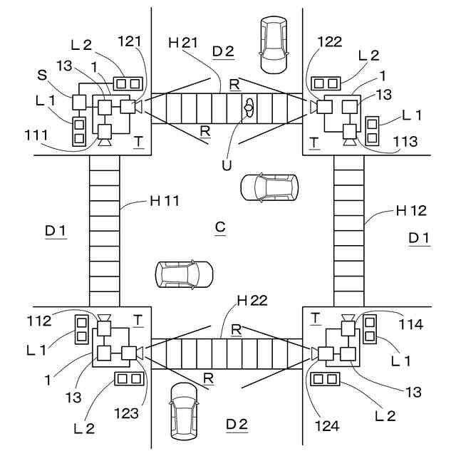 上記目的を達成するため、本発明に係る横断歩道誘導システムは、第1の方向、及び該第1の方向と異なる第2の方向に位置する第1、第2の横断歩道を備えた交差点において、該横断歩道を横断する視覚障害者に対して誘導を行う視覚障害者用誘導システムであって、前記第1、第2の横断歩道を送信方向とする、指向性のある第1、第2の超音波信号をそれぞれ送信する超音波信号送信装置と、前記視覚障害者が装着する装着端末とから構成され、前記超音波信号送信装置は、前記第1の横断歩道に対して点灯制御を行う第1の歩行者用信号灯器が青点灯、第2の横断歩道に対して点灯制御を行う第2の歩行者用信号灯器が青点灯の状態時にのみ、前記第1の横断歩道及び該横断歩道の横断を待機する待機場所を含む第1の通信エリア、前記第2の横断歩道及び該横断歩道の横断を待機する待機場所を含む第2の通信エリアに対して、それぞれ設定された送信間隔で前記第1、第2の超音波信号を繰り返し送信し、前記装着端末は、前記超音波信号を受信する受信部と、誘導音を出力するスピーカ部と、前記受信部及び前記スピーカ部と接続する制御部とから構成され、該制御部は、受信した前記超音波信号の前記送信間隔に応じた前記誘導音を前記スピーカ部に対して、前記超音波信号を受信している期間、継続して出力することを特徴とする。