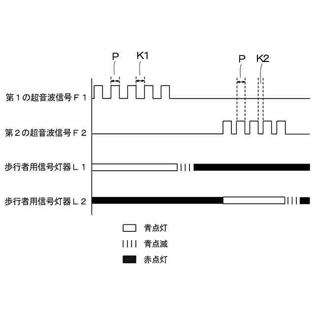 前記超音波信号送信装置は、前記第1の横断歩道に対して点灯制御を行う第1の歩行者用信号灯器が青点灯、第2の横断歩道に対して点灯制御を行う第2の歩行者用信号灯器が青点灯の状態時にのみ、前記第1の横断歩道及び該横断歩道の横断を待機する待機場所を含む第1の通信エリア、前記第2の横断歩道及び該横断歩道の横断を待機する待機場所を含む第2の通信エリアに対して、それぞれ設定された送信間隔で前記第1、第2の超音波信号を繰り返し送信し、
