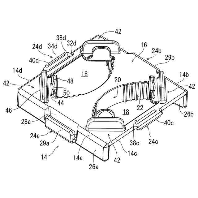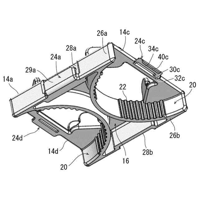 そこで、本発明者等は本願の出願に先立ち、使用済みの容器蓋をモザイク片として使用して立体的(三次元的)に配列することが可能な新規の接続具を発明し、かかる発明について本願の出願人は既に特許出願した(例えば特願2023-174660)。特願2023-174660の明細書等には、該物品の該スカート壁の外径に対応した内径を有する円筒形状乃至上方に向って内径が漸次低減する円錐台筒形状の内周面を備えた環状主部を備え、該環状主部の該外周面には第一の連結手段及び第二の連結手段が配設されており、1個の接続具の該第一の連結手段と他の1個の接続具の該第二の連結手段とを係合させて該1個の接続具と該他の1個の接続具とを連結することができ、該環状主部には、更に、間隔をおいて立設され且つ両者間に該物品の該スカート壁の下端部を挿入することができる2個の挟み片を有する少なくとも1個の挟み手段が配設されている、接続具が示されている(これを以下では「先行接続具」とする)。