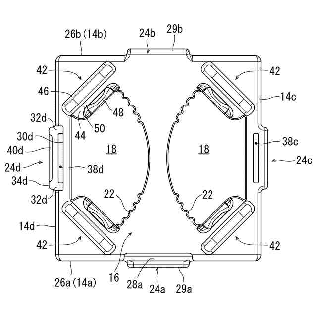 該下面には下方に垂下する垂下壁が形成され、該垂下壁は前記複数個の該物品の夫々の該スカート壁の外周面の一部と近接乃至当接する円弧形状の内面を有し、