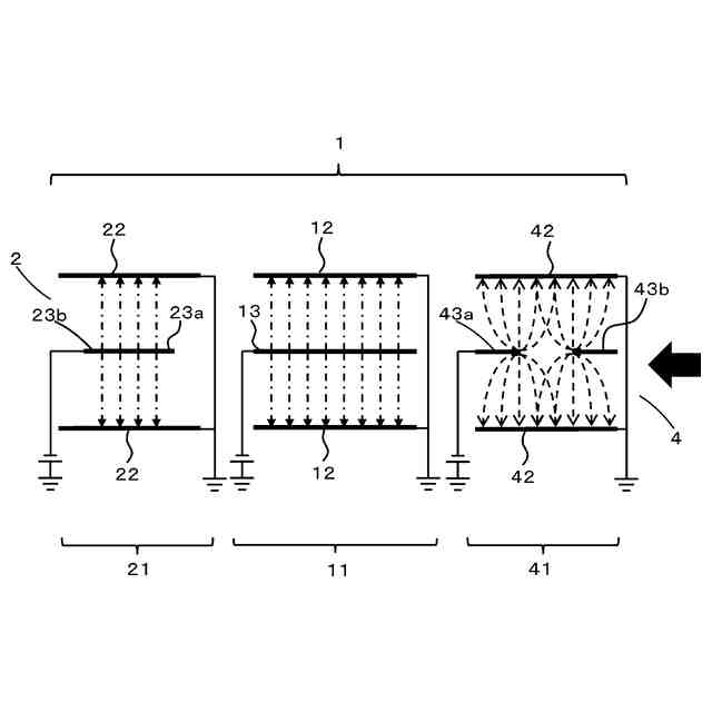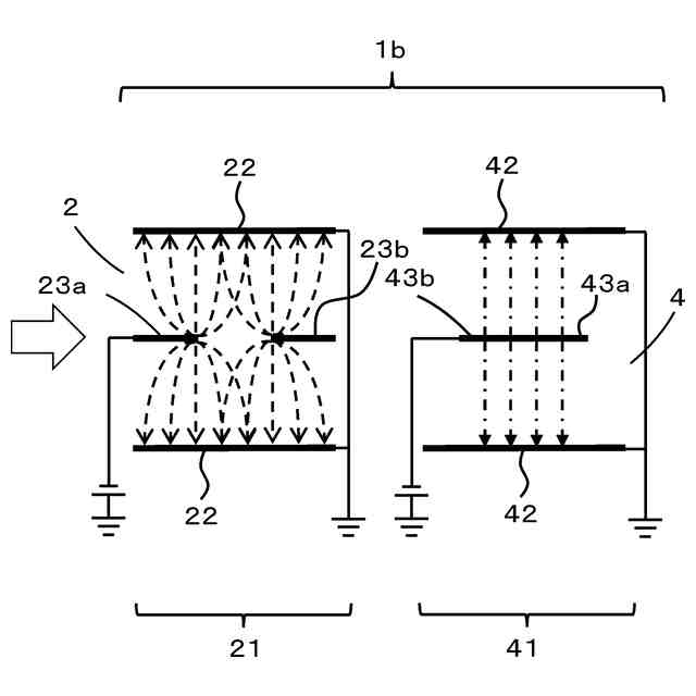 そして、この目的を達成するために、本発明に係る電気集塵装置は、粉塵を含む空気が流入可能に設けられた開口と、開口から流入する空気中の粉塵を荷電させる荷電部と、を備える。荷電部は、少なくとも2つ以上設けられ、開口から流入する空気の流れ方向に対して直列に配置されるものであり、これにより所期の目的を達成するものである。