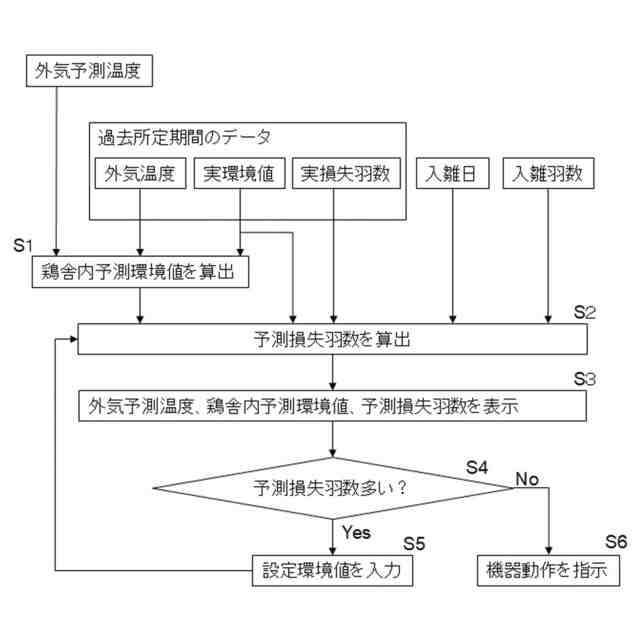 請求項10記載の本発明は、請求項9に記載の鶏損失予測方法において、前記機器動作指示ステップでは、前記設定環境値が入力されない場合には、前記鶏舎内予測環境値に基づいて前記機器動作指示を行うことを特徴とする。