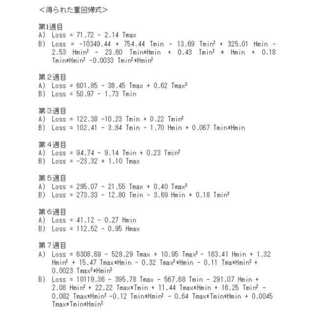 本発明における予測損失羽数算出に用いることができる重回帰式を示す図