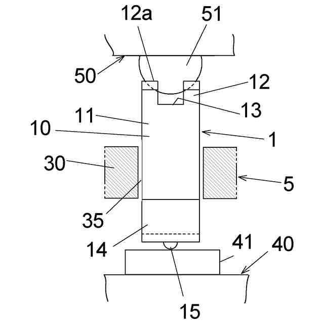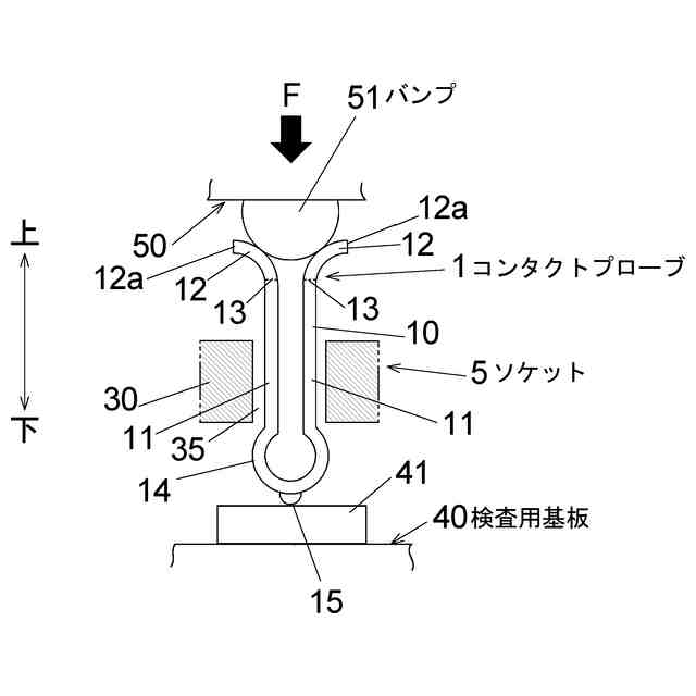 図1から図4を用いて本発明の実施形態1に係るコンタクトプローブ1及びソケット5を説明する。説明の便宜上、図1に上下方向を定義する。これらの図に示すように、コンタクトプローブ1は、相互に対向する一対の弾性片部11を一体に有する導電性板ばね10であって、各弾性片部11は、先端に向かって対向間隔が広がる向きに曲げられた先端曲部12を有する。図2及び図4のように先端曲部12には先端縁12aから基端方向に向かって切欠部13が形成されている。