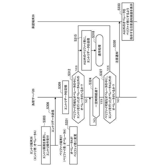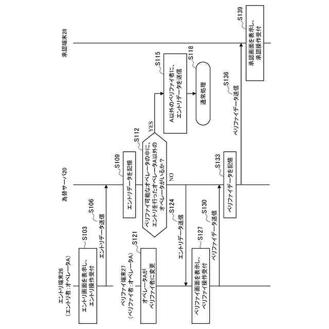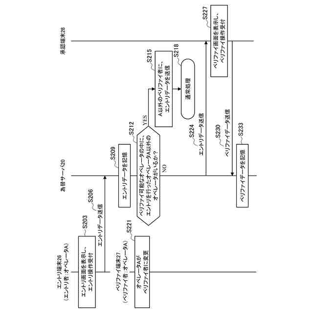 為替サーバにおいては、エントリデータとベリファイデータとが一致するか否かを判定する。そして、エントリデータと不一致であるベリファイデータがある場合には、3人目のオペレータによってエントリデータと不一致であるベリファイデータに対する承認または差し戻しがなされる。