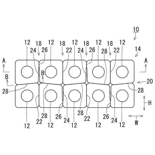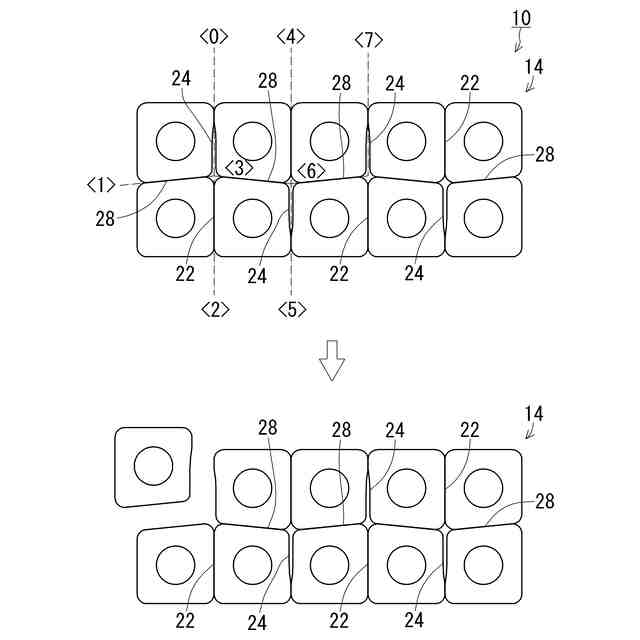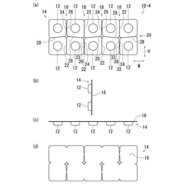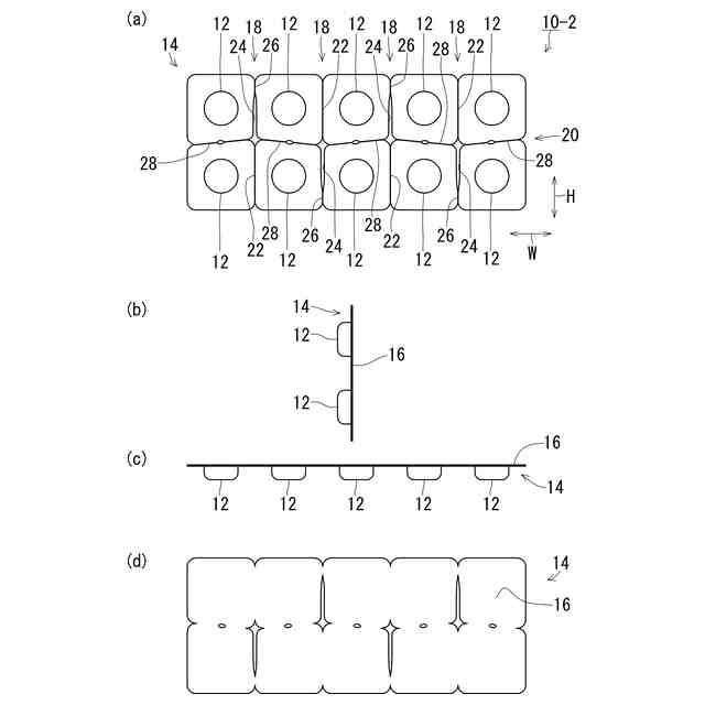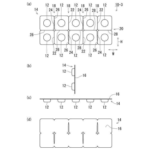 ブリスタ包装体は、薬品に限らず、菓子等の食品、化粧品、雑貨、電池、日用品等の包装にも広く使用されている。従来のブリスタ包装体は、本体シートのそれぞれの収容凹部どうしの間にスリット状の溝やミシン目からなる切取線が形成されており、所定の包装単位ごとに切り離すことができるものも知られている(例えば、特許文献1参照)。図20、図21は、本体シート101に錠剤等を収容する収容凹部102が2列5行形成された従来のブリスタ包装体100の例を示している。図20の従来例では、ブリスタ包装体100には、収容凹部を1個ずつ切り離しできるように、それぞれの収容凹部102どうしの間に縦切取線104及び横切取線105が形成されている。この縦横の切取線によって、例えば、必要な個数分(例えば、1個、2個、3個・・・)を切り離して、錠剤を取り出して服用したり、携帯したりすることができるものである。一方、図20の従来例のような収容凹部を1個ずつ切り離すことができる態様では、切り離したブリスタ包装体のシートごと口に入れて飲んでしまうといった誤飲のおそれがあり、過去にも誤飲事故も発生している。これに対して、近年では、図21に示すように、横に並ぶ2個の収容凹部102を最小の単位として切り離すことができるように横切取線105のみが形成されたものが普及している。