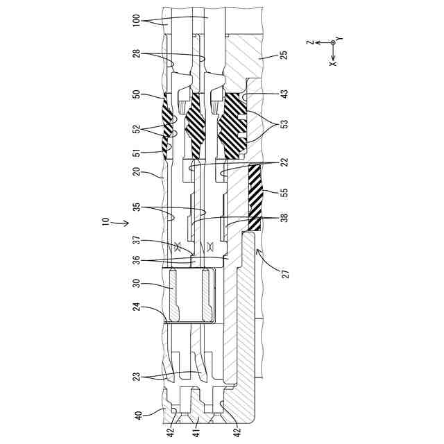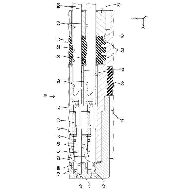 図5は、本実施形態1のコネクタにおいて、ハウジングを左右方向に沿って切断し、第1干渉部および第2干渉部を上方から見た斜視図である。