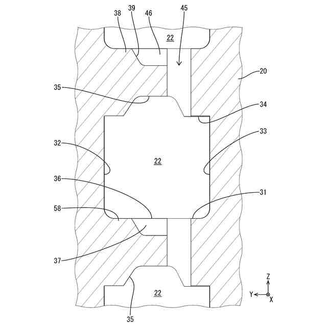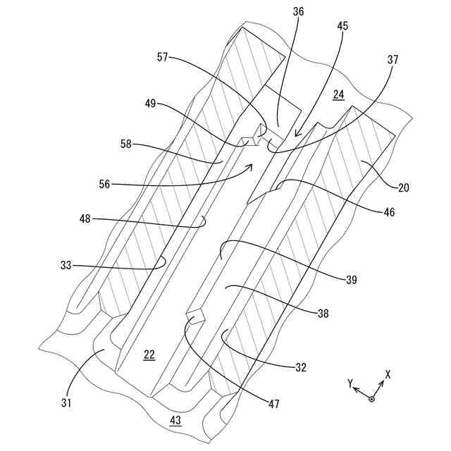前記第2干渉部は、前記キャビティの内面に台形に形成され、前後方向に延びる乗り上げ面と、後方へ向けて傾斜して乗り上げ面の前端に連なる前方傾斜面と、を有し、