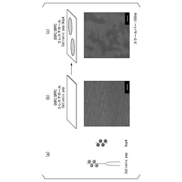 Cationic pepを含むリン脂質構造体に対してAsp4を添加した場合の原子間力の作用の模式図および顕微鏡画像である。
