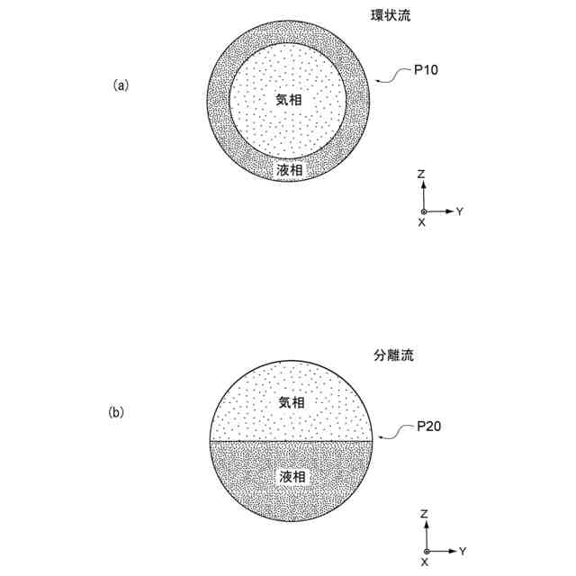 但し、熱交換器にヘッダ空間を備えても、ヘッダ空間に流入した気液二相冷媒が流路に均等に流入するとは限らない。その要因として、例えば、ヘッダ空間の途中で気液二相冷媒が環状流の状態を維持できずに分離流となることがあげられる。このような場合、液冷媒の流量の少ない流路では液冷媒が速く蒸発してしまい、ガス冷媒の顕熱変化のみの熱交換となるため、熱交換器の熱伝達率が低下する。