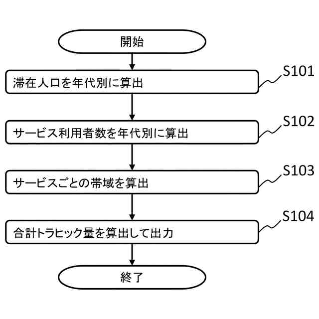 【解決手段】 本発明は、ユーザ装置をネットワークに接続させる通信システムで発生するトラヒックを予測するトラヒック予測装置に関する。そして、本発明のトラヒック予測装置は、注目エリアにおける属性別人口情報と属性別サービス利用割合情報とサービス帯域情報とを含む情報を収集する情報収集手段と、注目エリアにおける注目時刻の人口推移情報を含む情報を保持する情報保持手段と、情報収集手段が収集した情報と、情報保持手段が保持した情報とに基づいて、注目エリアで発生するトラヒックの合計帯域を算出する算出処理手段とを有することを特徴とする。