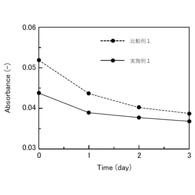 実施例1および比較例1に係る耐湿熱性評価結果(吸光度)を示すグラフである。
