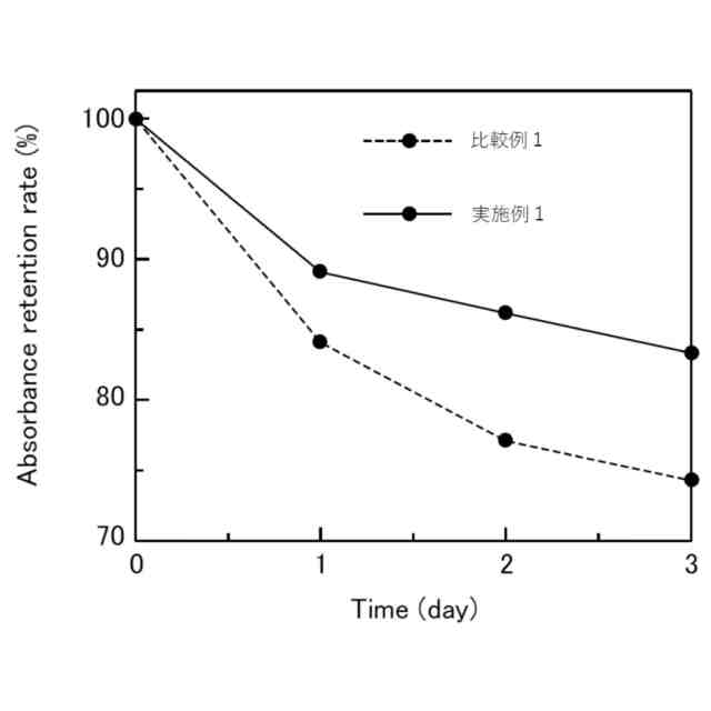 実施例1および比較例1に係る耐湿熱性評価結果(吸光度維持率)を示すグラフである。