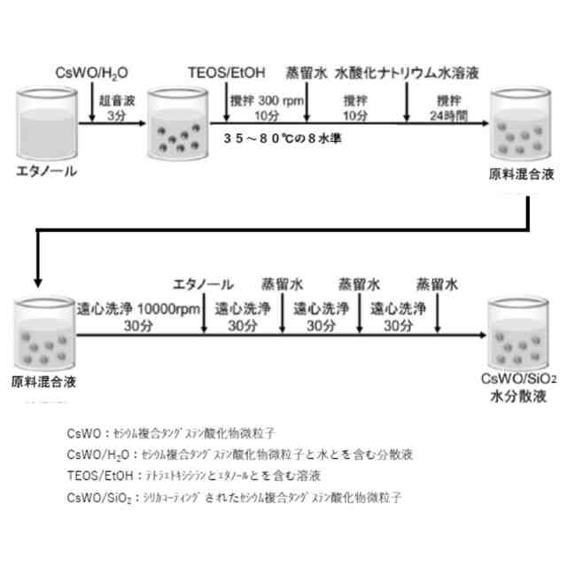 近赤外線吸収材料微粒子を被覆する従来の技術は、被覆膜の膜厚の均一性において課題を有するものであった。具体的には、被覆膜の膜厚が厚すぎる場合、被覆処理によって粒子径が大幅に増大し、粒子1つあたりの光の散乱の大きさ(散乱断面積)が増大してしまう。一方で、被覆膜の膜厚が薄すぎる場合、熱や水による酸化からの防護が十分ではない。