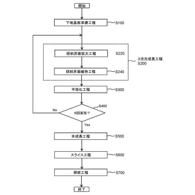 (d)前記3次元成長層上にIII族窒化物半導体の単結晶を更にエピタキシャル成長させることで、傾斜界面を消失させ、(0001)面からなる鏡面化された表面を有する平坦化層を成長させる工程と、