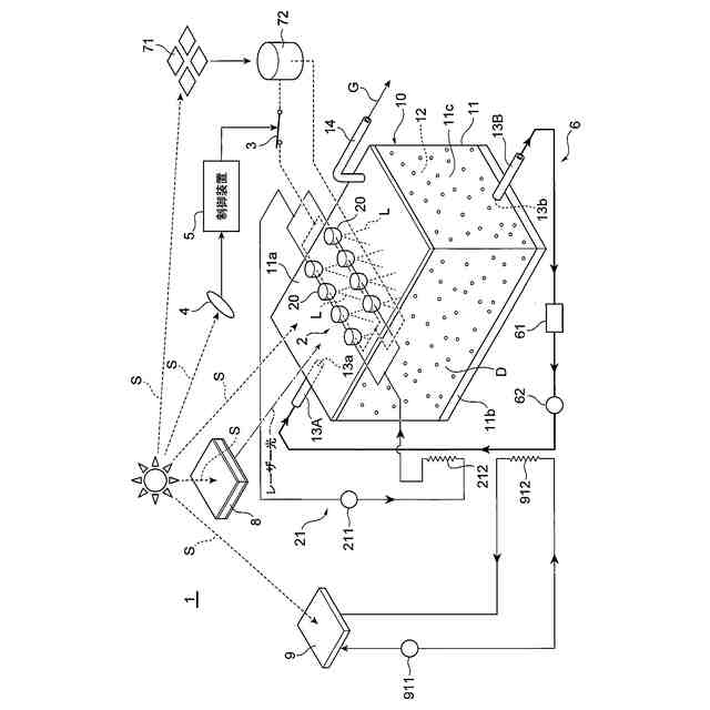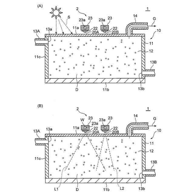 図1は、本実施形態に係るガス生成システム1の全体の概略図である。図2(A)および図2(B)は、図1に示す筐体11および照射装置2の断面図である。ガス生成システム1は、光触媒を水の分解反応に寄与させ、その結果、酸素ガスおよび水素ガスから成る混合ガスGを発生させるためのシステムである。光触媒に接触した水は、日中の晴天時等の環境下であれば、太陽光Sによって分解され、混合ガスGが発生する。ここで、本実施形態において、光触媒に接触した水は、光触媒の粒子を分散した分散液Dの水である。
