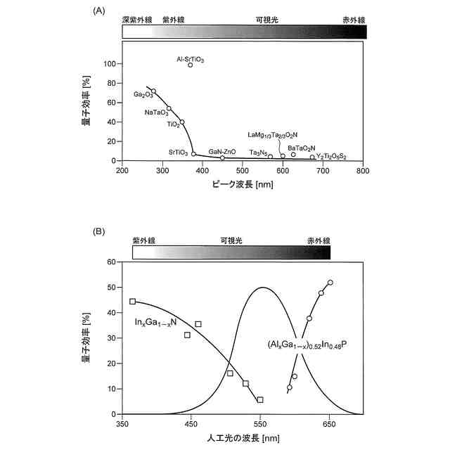 (A)は、光触媒について、ピーク波長と量子効率の関係を表すグラフである。(B)は、発光素子の材料について、人工光の波長と量子効率の関係を表すグラフである。