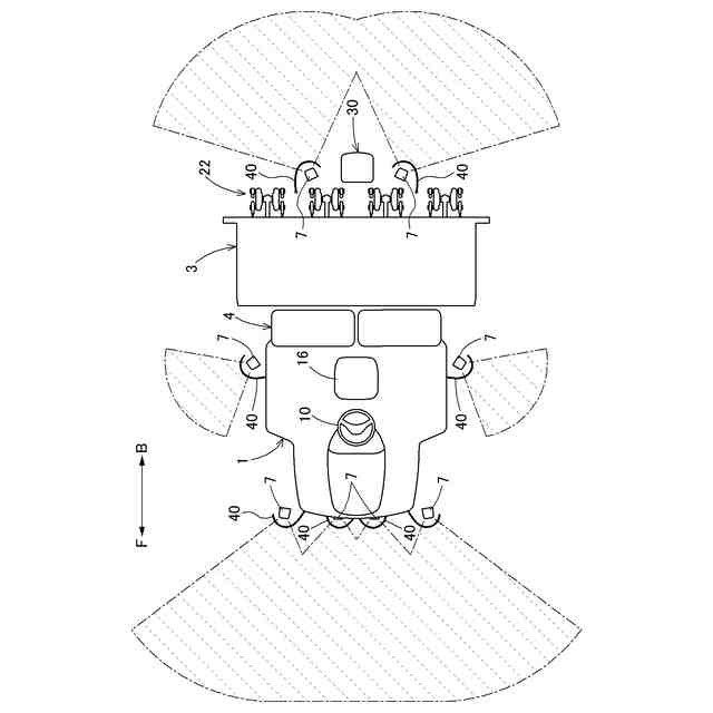 車体の周囲を走査する非接触物体検出センサによる物体検出の邪魔をしないためには、非接触物体検出センサの走査範囲内に、センサガードが位置しないことが好ましい。多くの非接触物体検出センサの走査範囲は、左右方向及び上下方向(特に上方)に拡大していくので、非接触物体検出センサの下方が接触式の障害物センサの位置として好適である。また、センサガードは、非接触物体検出センサが物体と接触する前に、物体に接触する必要がある。このことから、本発明では、前記センサガードの地上高さは、前記非接触物体検出センサより低く、かつ、前記センサガードは、平面視で前記非接触物体検出センサを外囲するように配置されている。