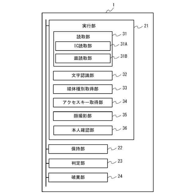 前記保持手段は、前記媒体にIC(Integrated Circuit)チップが搭載されている場合に前記媒体を用いた前記手続きにおいて前記媒体の前記ICチップにアクセスするために取得されたアクセスキー及び/又は前記媒体を用いた前記手続きにおいて行われた前記読取ユニットによる前記媒体の読取処理に基づき得られた前記媒体に記録された情報を含む、前記媒体を用いた前記手続きにおいて取得された前記情報を保持し、