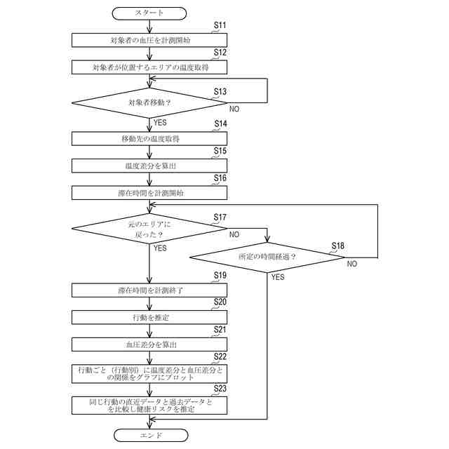 【解決手段】移動先のエリアにおける対象者の行動を推定可能(ステップS20)な行動推定部と、行動推定部によって推定される行動ごとに、移動先のエリアの第2の温度と移動前のエリアの第1の温度との差である温度差分と、対象者が移動先のエリアから移動前のエリアに帰ってきたときの第2の血圧値と対象者が移動前のエリアにいたときの第1の血圧値との差である血圧差分との関係を示す温度血圧データを取得する(ステップS15、S21、S22)温度血圧データ取得部と、第一の期間における温度血圧データである第一温度血圧データと、第一の期間よりも過去のものであって第一温度血圧データの行動と同様な行動の温度血圧データである第二温度血圧データとの比較結果に基づいて対象者の健康リスクを推定可能(ステップS23)な健康リスク推定部と、を具備する。